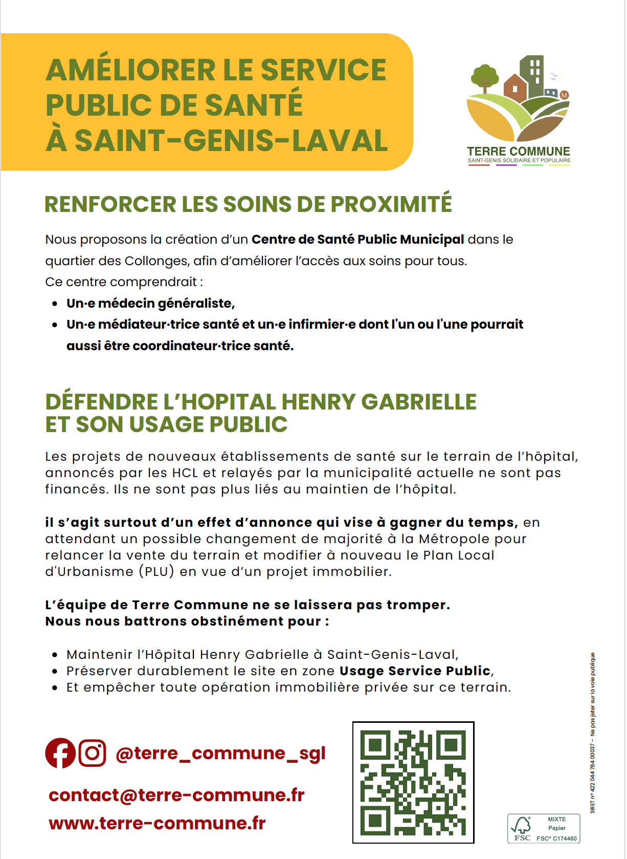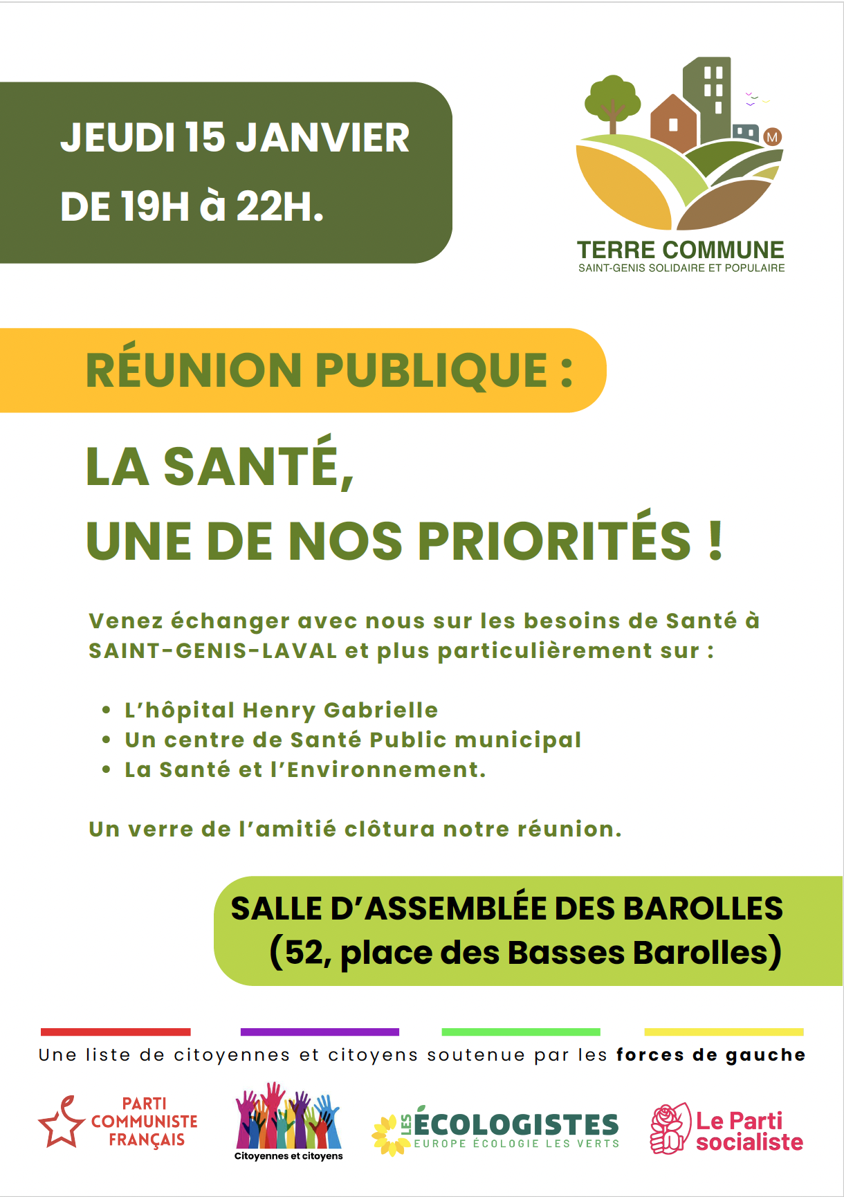 Terre Commune est un collectif engagé pour imaginer et construire l’avenir de Saint-Genis-Laval, avec vous et pour vous. Face à une ville dortoir qui stagne depuis plusieurs années, nous portons une ambition claire : renforcer les services publics, redynamiser la vie locale et faire vivre pleinement la participation citoyenne. Notre contrat municipal pour la période 2026-2032 est le fruit d’un travail collectif, nourri par des échanges avec de nombreuses Saint-Genoises et Saint-Genois, attaché·es à leur ville et désireux·ses de la faire évoluer. Ce projet citoyen propose des actions concrètes en réponse aux enjeux de notre commune que vous estimez insuffisants comme :