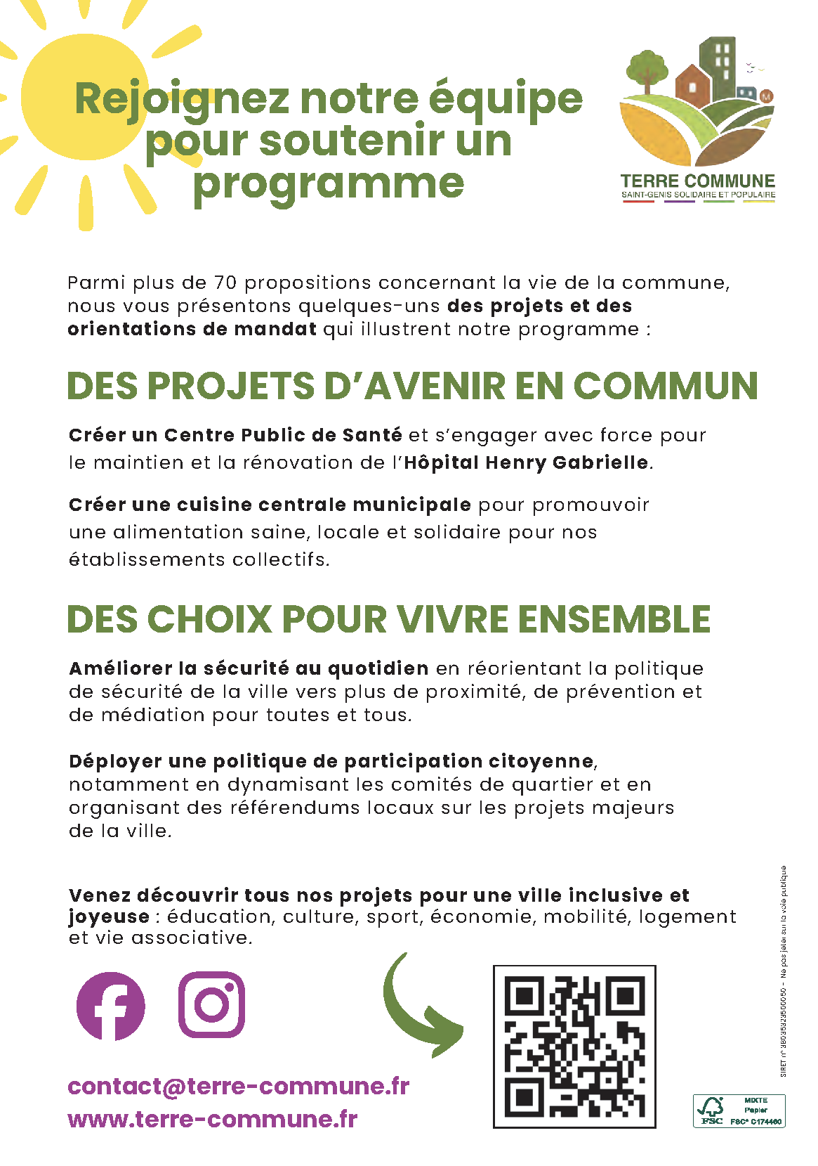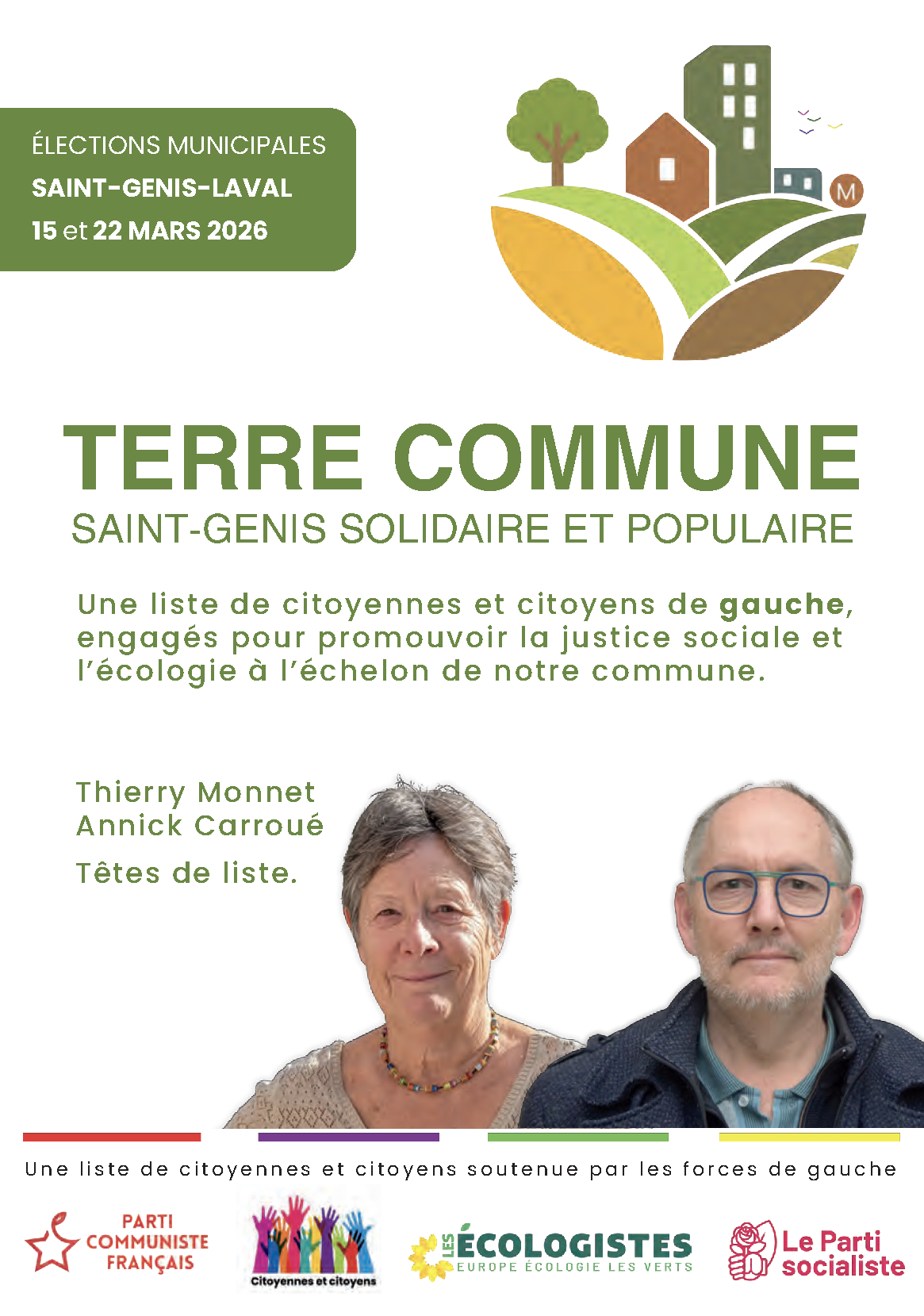 Terre Commune est un collectif engagé pour imaginer et construire l’avenir de Saint-Genis-Laval, avec vous et pour vous. Face à une ville dortoir qui stagne depuis plusieurs années, nous portons une ambition claire : renforcer les services publics, redynamiser la vie locale et faire vivre pleinement la participation citoyenne. Notre contrat municipal pour la période 2026-2032 est le fruit d’un travail collectif, nourri par des échanges avec de nombreuses Saint-Genoises et Saint-Genois, attaché·es à leur ville et désireux·ses de la faire évoluer. Ce projet citoyen propose des actions concrètes en réponse aux enjeux de notre commune que vous estimez insuffisants comme :